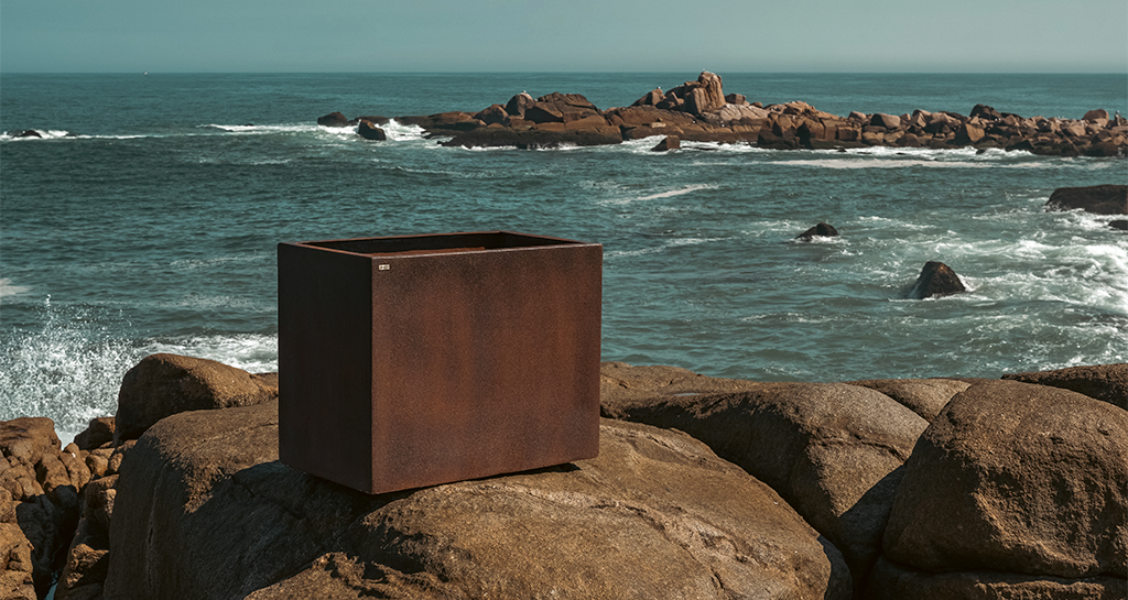 O efeito monumental do Aço Corten em um Vaso de Fibra de Vidro. O Corten agora em um produto leve e resistente para o seu projeto.